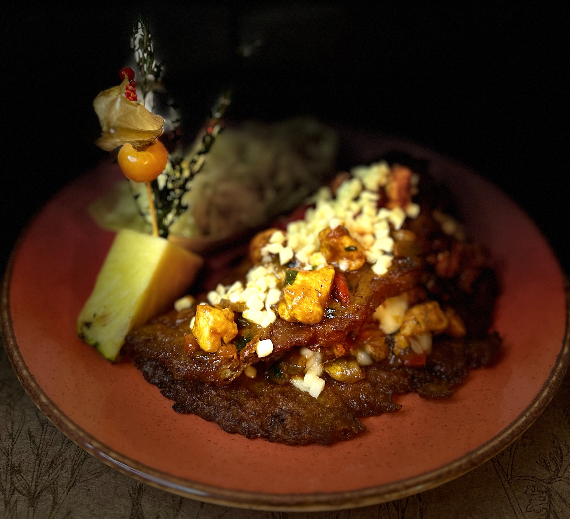 Z PLACKÓW ZIEMNIACZANYCH PRZEKŁADANA RUMSZTYKIEM Z CIECIERZYCY, SZPINAKIEM ORAZ SEREM PODANA NA SOSIE GRZYBOWYM